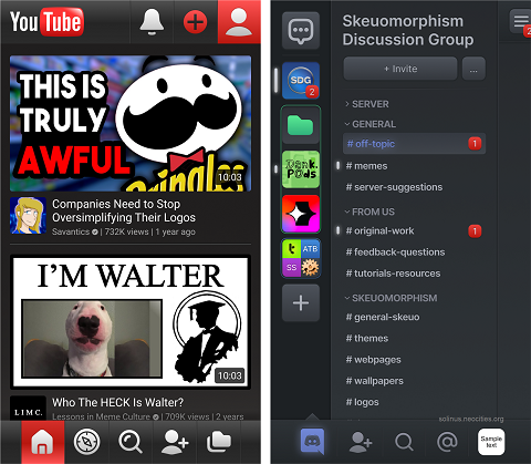 My redesigns of YouTube and Discord in a plastic-like skeuomorphic style.